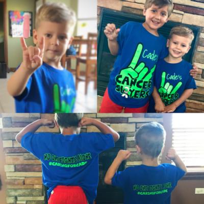 Amanda posted today on FB about the shirts being for sale with some pictures that I managed to get of the boys wearing theirs. This was an exhausting effort by the way. Thirty-some pictures later and I managed to get a few usable ones. I envy all those people that post all these adorable pictures of their children together cooperating and smiling. I think I have a total of five of the two of my boys together, both actually smiling, both sets of eyes open at the same time. Five is probably actually being generous. Haha. The amount of love we have received from people buying these shirts, wanting to wear them, excited to wear them and show support for Cade. It has been absolutely heartwarming today. There are so many people that want them, that she told me she will be placing a re-order next week. I don’t even know what else to say but thank you. Thank you so much! Although Cade may not fully understand the meaning behind it, it means the world to us!! I can’t wait to see all the pictures so please be sure to take pictures wearing them and post them with #caringforcade