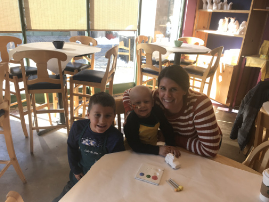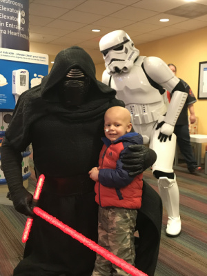 Tuesday we had a family day. We went out to breakfast at one of Cade’s favorite places- Brunch Cafe. Then we all went to Color Me Mine in Crystal Lake where they got to pick something to paint. Cade was really wanting to paint a Spider-Man mug so he could have his own just like brother. But go figure, they were all sold out. Guess that means we’ll just have to go back again 😉 They had fun though. Very short attention span, so thankfully they both picked something small seeing as Chris and I still had to help paint a lot since you need 3 coats on everything. It was a really nice day. Wednesday we had appointments back at the hospital for his kidney and hearing tests as well as his clinic visit for dressing change and labs. While running around the hospital he got to see a bunch of the Star Wars characters. So fun! Wednesday was the soonest they would admit him based on the timing of his last round. If you remember with the last round, we were home for over 2 weeks and had come to our clinic appointments three times before actually being admitted to stay and start due to his counts not being high enough. They were hopeful that since he got a larger amount of cells for his stem cell transplant with the second round, he would recover his counts a little quicker and better this time. And he definitely did. Monday his platelets were 33! Last time they never came up past 18. Wednesday when we came in his counts had dropped a little bit from Monday, but he was still admitted! I only had to pack up the car once this time, we were admitted on the first shot. So exciting! He knew we were staying to start his medicine again and he was excited to come back to the unit as he kept saying to me over and over again, “come on! Let’s go see all my friends!” When we walked over to the unit, he saw Miss Kiera and went running to her and gave her a big hug. It was the sweetest thing ever. Given that we have to be somewhere that no one ever wants to be, I am so grateful that he has so many faces he loves seeing and that he actually associates being here in a positive nature. It’s a blessing in the face of this storm.